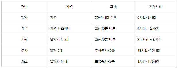 - 대부분 알약으로 정제되며 그 외엔 알약을 분쇄한 가루형, 시럽형, 주사형, 가스형이 있습니다.
